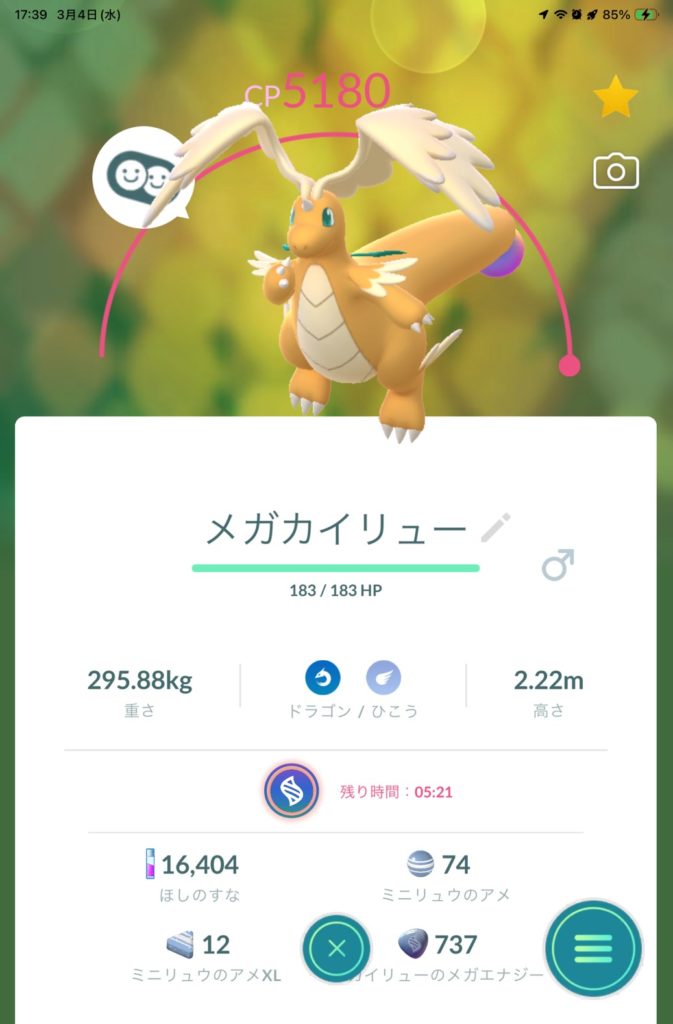 ・メガカイリューはカイリューのメガ進化バージョンで、育成状況はメガレベルはマックス、PLは42くらいとなっております。