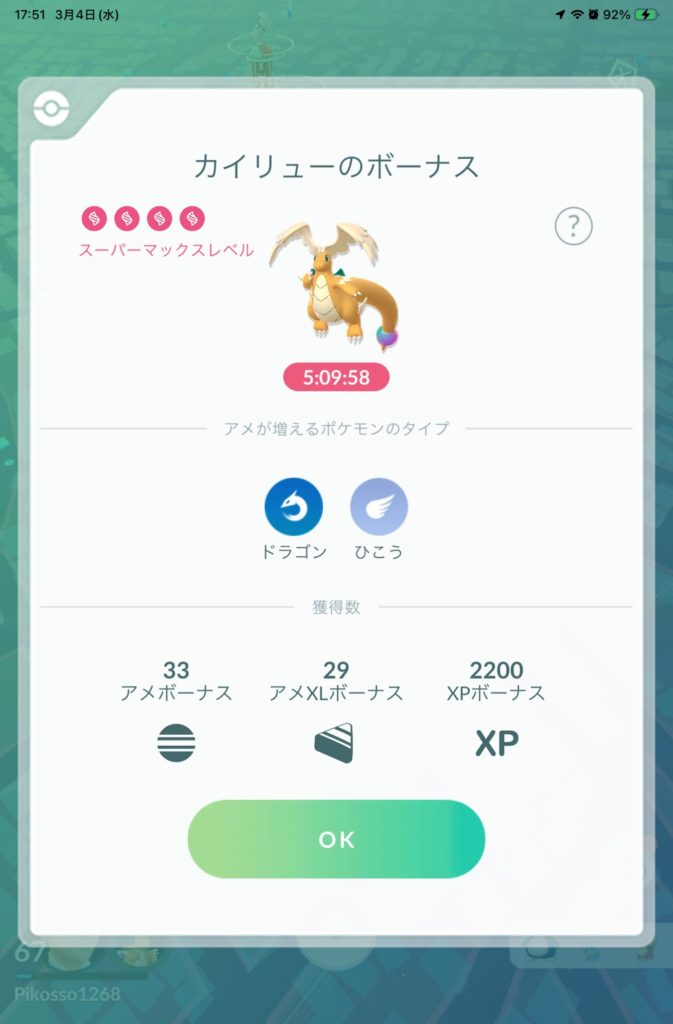 カイリューがメガ進化することによって、ポケモンを捕獲した際にゲットできるXPボーナスがとても多いです。画像では2200XPボーナスももらっております。